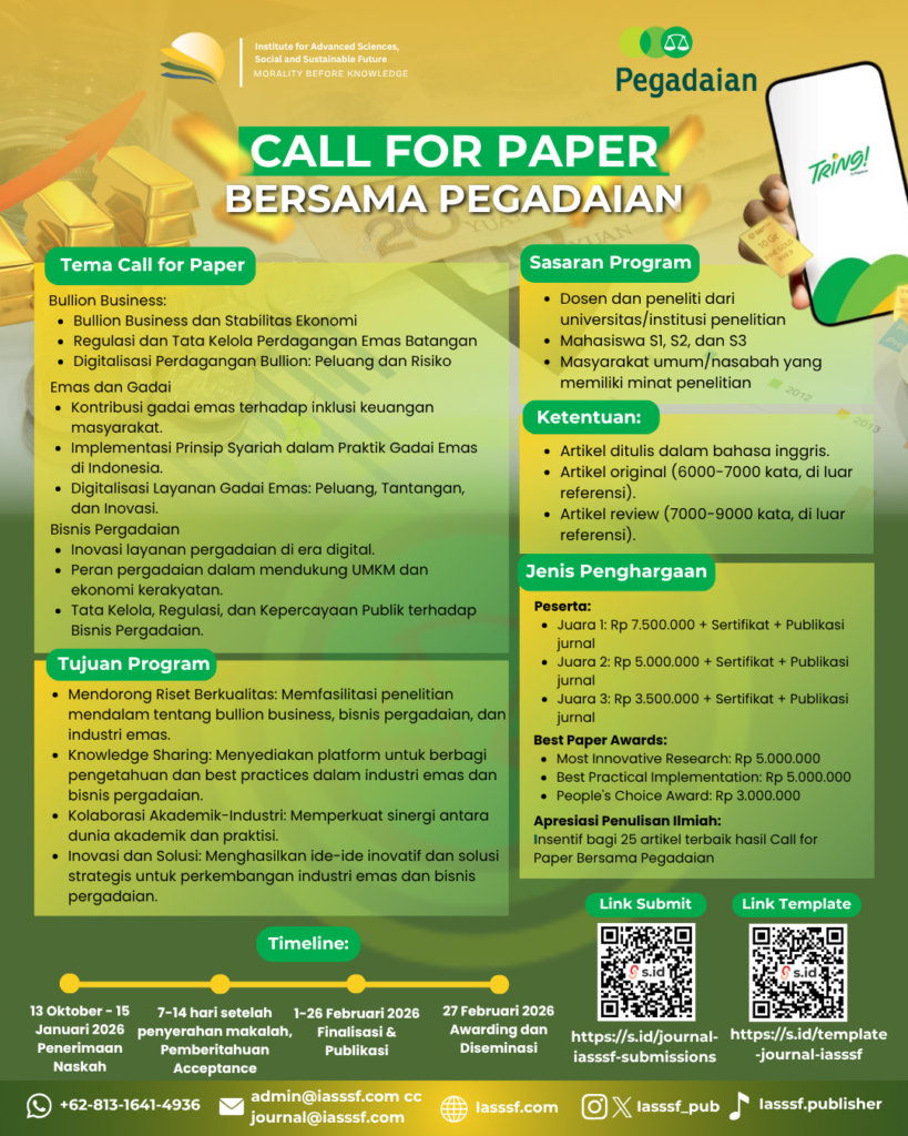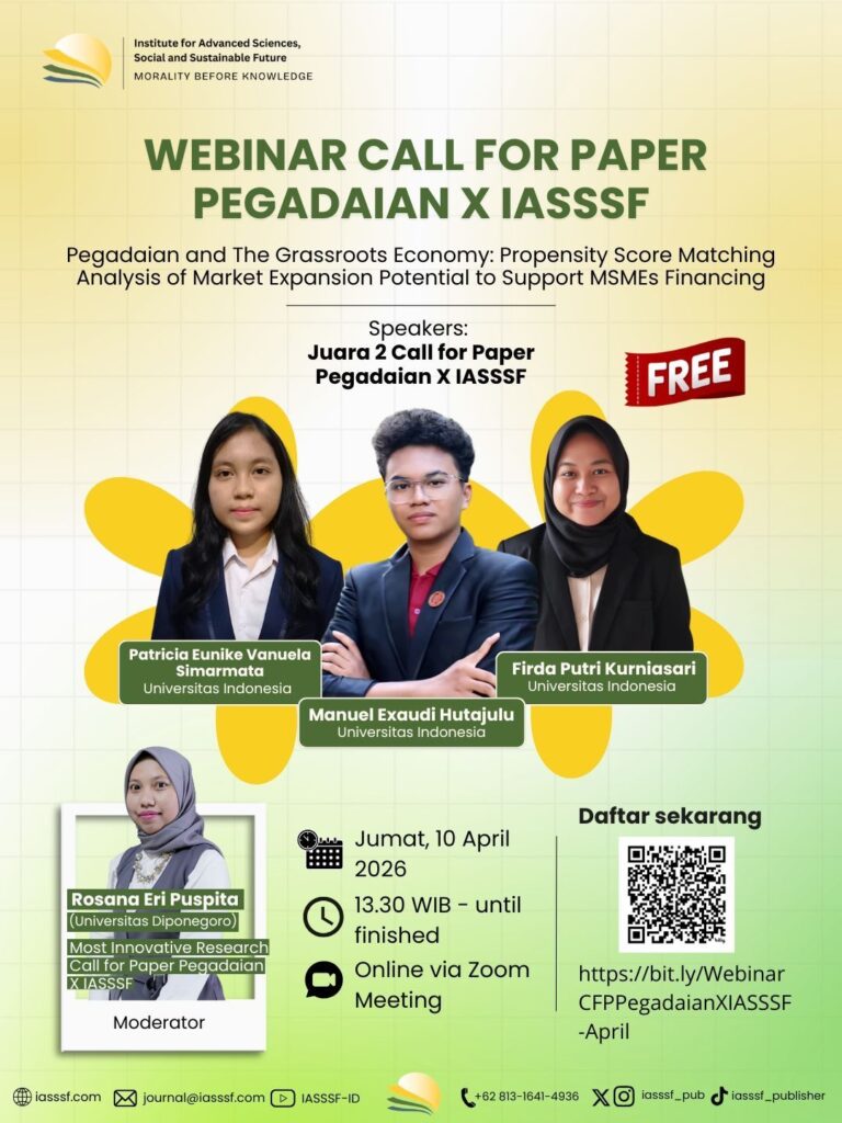 Institute for Advanced Science, Social, and Sustainable Future (IASSSF) is part of PT. Kiat Cendekia Alami, established in 2021 (pursuant to the Decree of the Minister of Law and Human Rights of the Republic of Indonesia, No. AHU-00176.AH.02.01.TAHUN 2021). IASSSF strives for better access to research and applied knowledge through all its services. All publications are fully open-access, and other services are tailored to meet the needs of the community and are offered at rates accessible to any interested individual. Under the principle of "Morality Before Knowledge," IASSSF believes in the virtue of a greater academic culture that serves the wider community.
