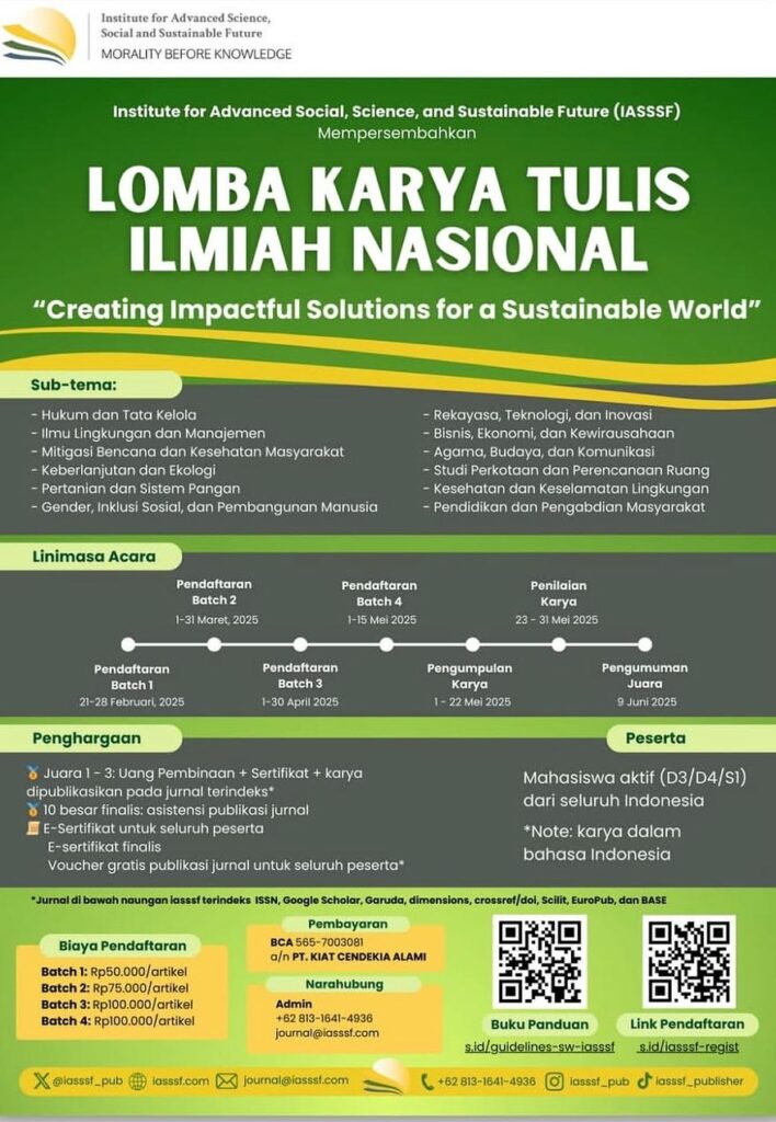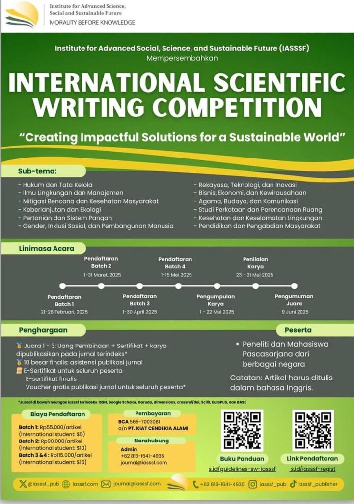 IASSSF organizes a range of academic events, including conferences, workshops, and competitions, to foster knowledge exchange and innovation at both national and international levels. We manage over 80 journals, including 23 accredited and indexed in SINTA (Levels 2–4). To explore all our journals, please visit journal-iasssf.com.
